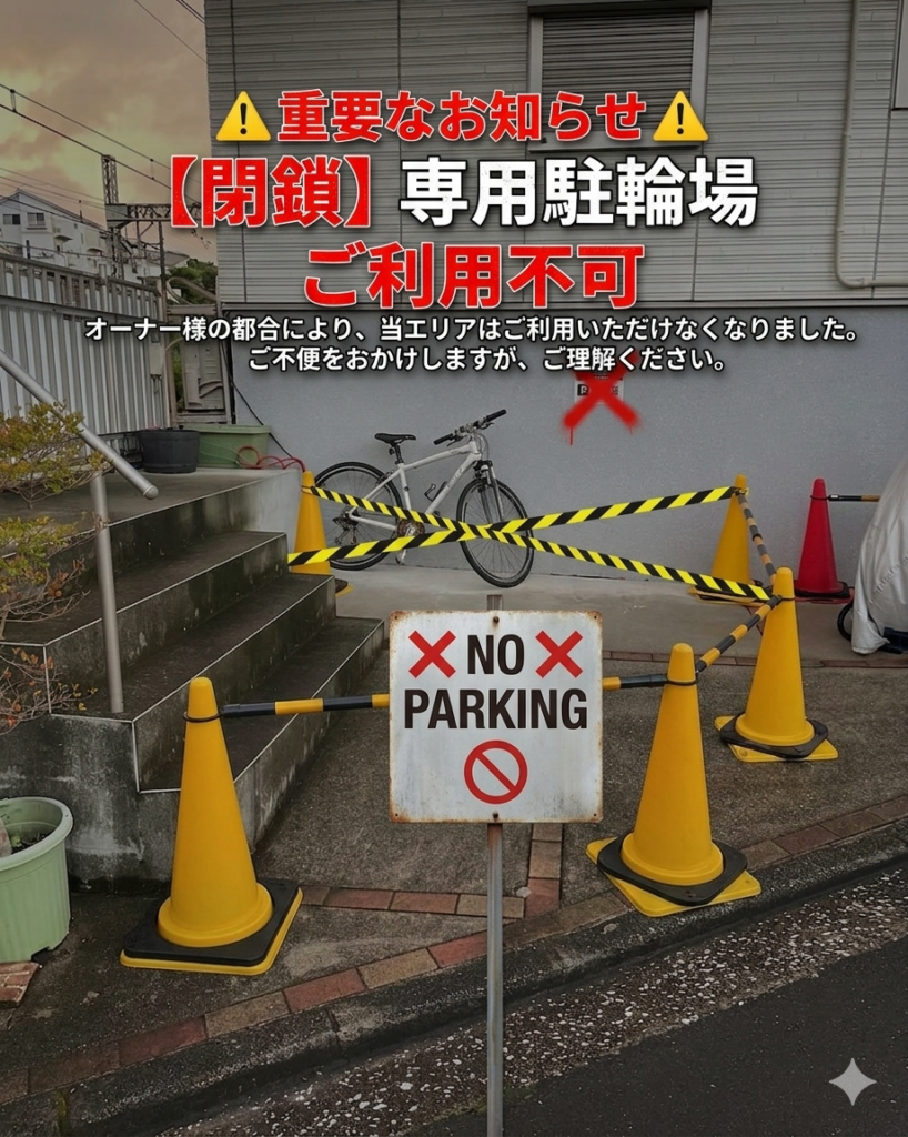 お写真の通り、これまでご利用いただいておりました店舗横の駐輪スペースですが、オーナー様のご事情により、急遽今週より閉鎖となりました。