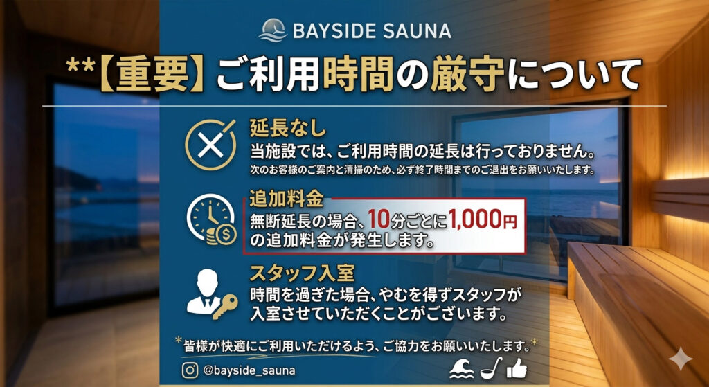 - 超過料金の発生:万が一時間を過ぎた場合、【10分ごとに1,000円】の追加料金を申し受けます。